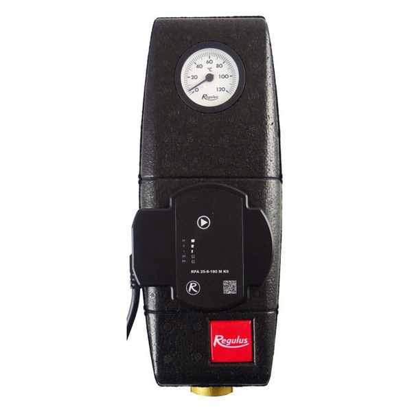 Jednotrubková čerpadlová skupina v izolaci s nízkoenergetickým čerpadlem Regulus RPA 25-8, se dvěma kulovými kohouty, zpětným ventilem a teploměrem. Připojení 1" F.