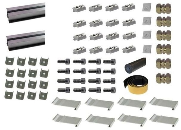 H profil, držáky na spodek kolektoru, přítlačné destičky, šrouby, matice, izolace, přímá šroubení. Pro uchycení na střechu nutno objednat dle typu střechy 10 háků nebo 5 podpěr a 1 vzpěru.