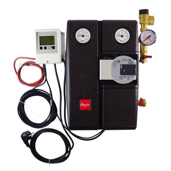 Obsahuje zásuvku pro spínání doplňkového zdroje (kotle), kabel s konektorem pro ovládání zdroje a 2 zapojená čidla do zásobníku. Obsahuje elektronické měření průtoku zobrazené na displeji.