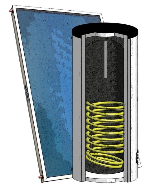 Solární sestava pro přípravu TV pro 3-5 osob s možností dohřevu el. tělesem v 250l solárním zásobníku s jedním výměníkem.