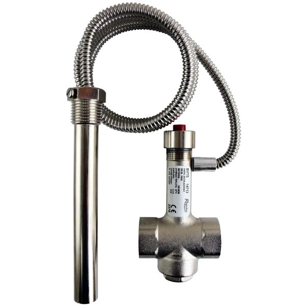 Termostatický dochlazovací ventil BVTS s niklovaným povrchem pro použití k ochraně kotlů na tuhá paliva před přehřátím. Připojení trubek G 3/4 F, připojení na zdroj tepla G 1/2“ M, otevírací teplota 97 °C, délka kapiláry 1,3 m, jímka 140 mm.“